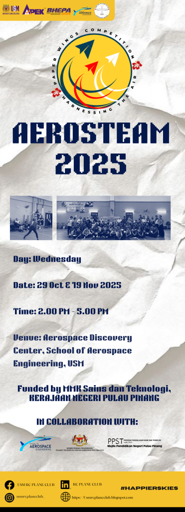 Funded by MMK Sains dan Teknologi, KERAJAAN NEGERI PULAU PINANG in Collaboration with School of Aerospace Engineering, Universiti Sains Malaysia, PPST Program Penggalakan Sains dan Teknologi, Majlis Pendidikan Negeri Pulau Pinang, Pejabat Pendidikan Daerah Seberang Perai Selatan and USM RC Plane Club.