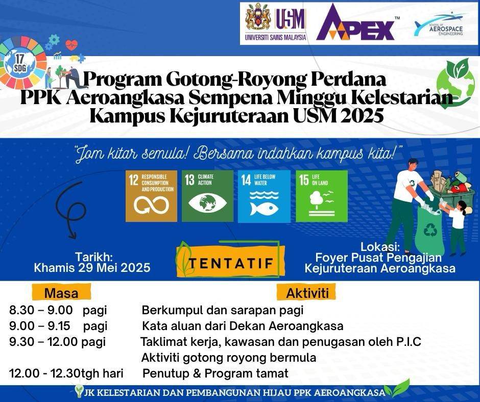 School of Aerospace Engineering successfully organized the "Gotong-Royong Perdana" in conjunction with Sustainability Week 2025 at the Engineering Campus. The program included opening remarks by the Dean, briefing sessions from the School's Sustainability Officer, and group activities that focused on recycling and campus cleanliness, supporting the Sustainable Development Goals (SDG 12, 13, 14 & 15). This collaborative effort fostered environmental awareness while enhancing the beauty and sustainability of the campus.